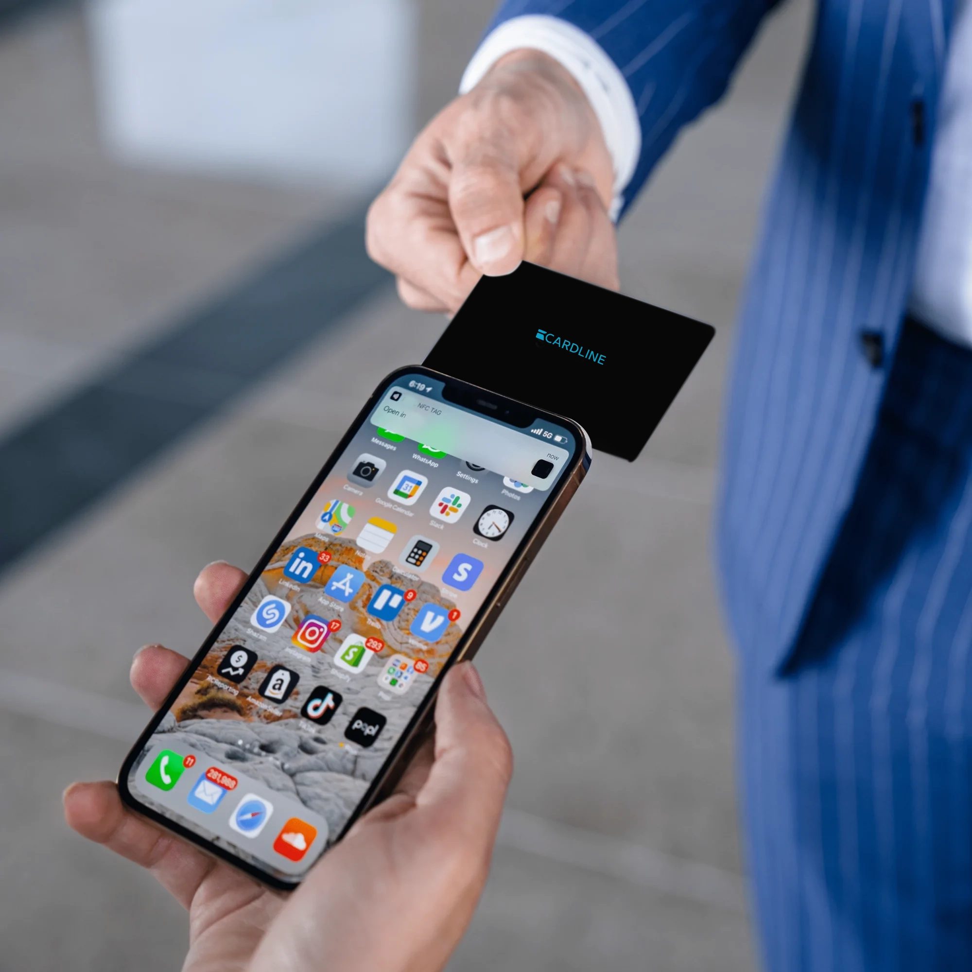 Tap your Cardline Card to the back of any compatible smartphone or use the QR code on the back to instantly share your contact info, social media, websites, payment apps and more.